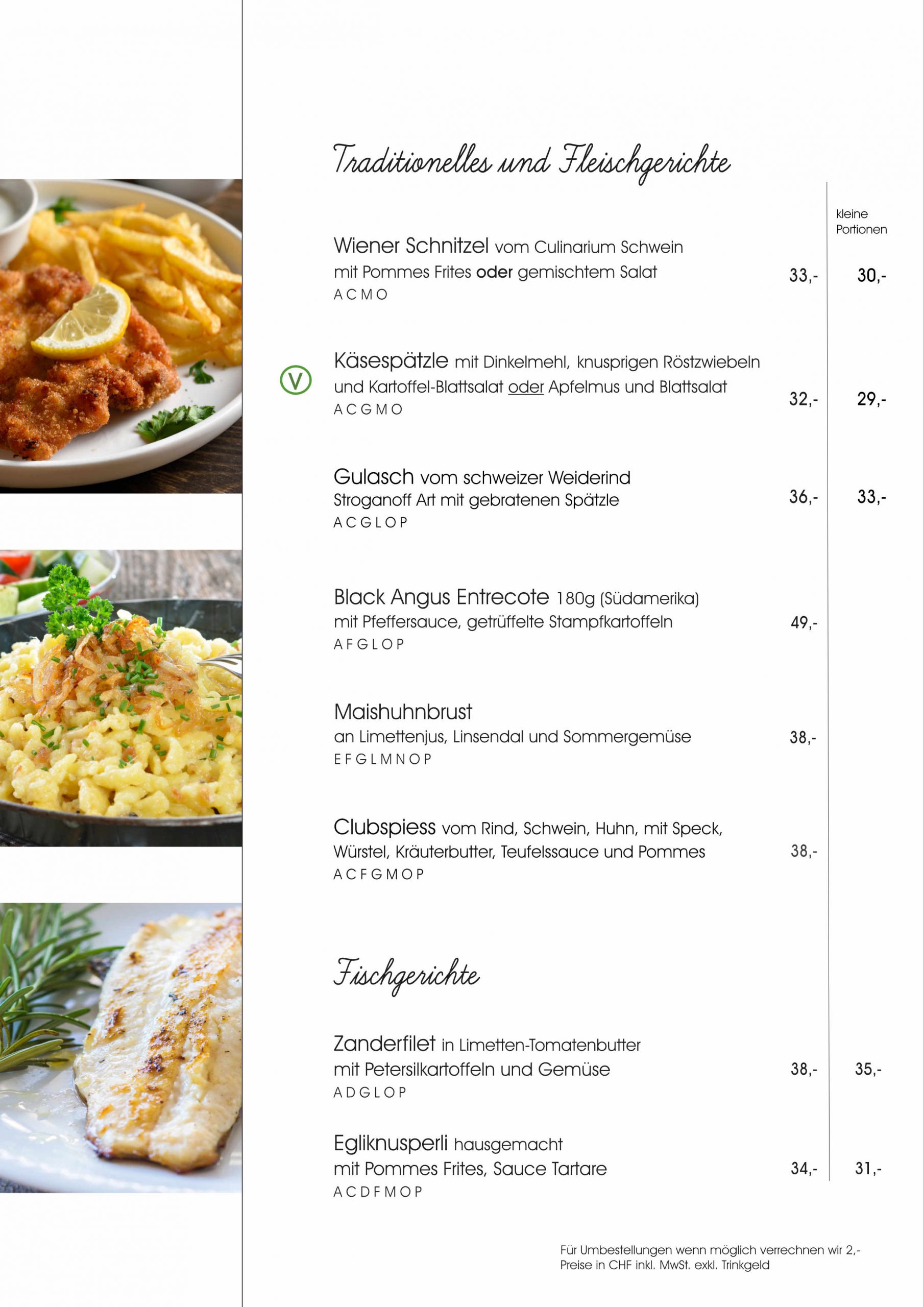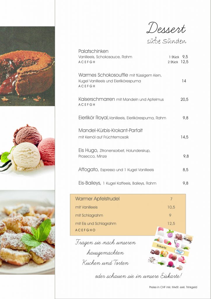 Natürlich dürfen auch raffinierte Fischgerichte nicht fehlen: Zanderfilet in Limetten-Tomatenbutter sowie hausgemachte Egliknusperli mit Pommes und Sauce Tartare sorgen für Abwechslung und Genuss auf höchstem Niveau.